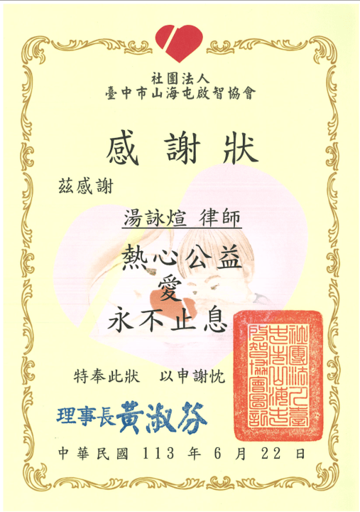 ♚ 社團法人台中市山海屯啟智協會 感謝狀